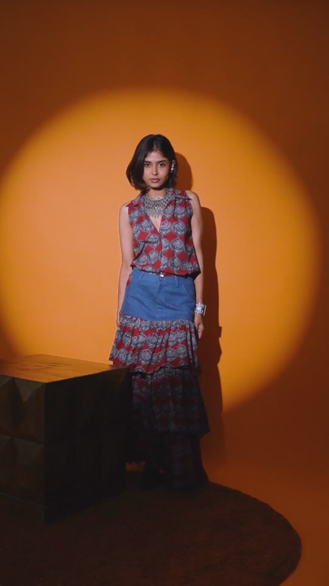 A perfect blend of traditional craft and modern silhouette, the Gulnaar Ajrakh Set brings earthy elegance to life. Handcrafted in soft cotton, it features an intricately block-printed Ajrakh pattern in deep maroon and indigo hues. The sleeveless collared top pairs beautifully with a layered flared skirt, creating a statement look that’s both bold and graceful.